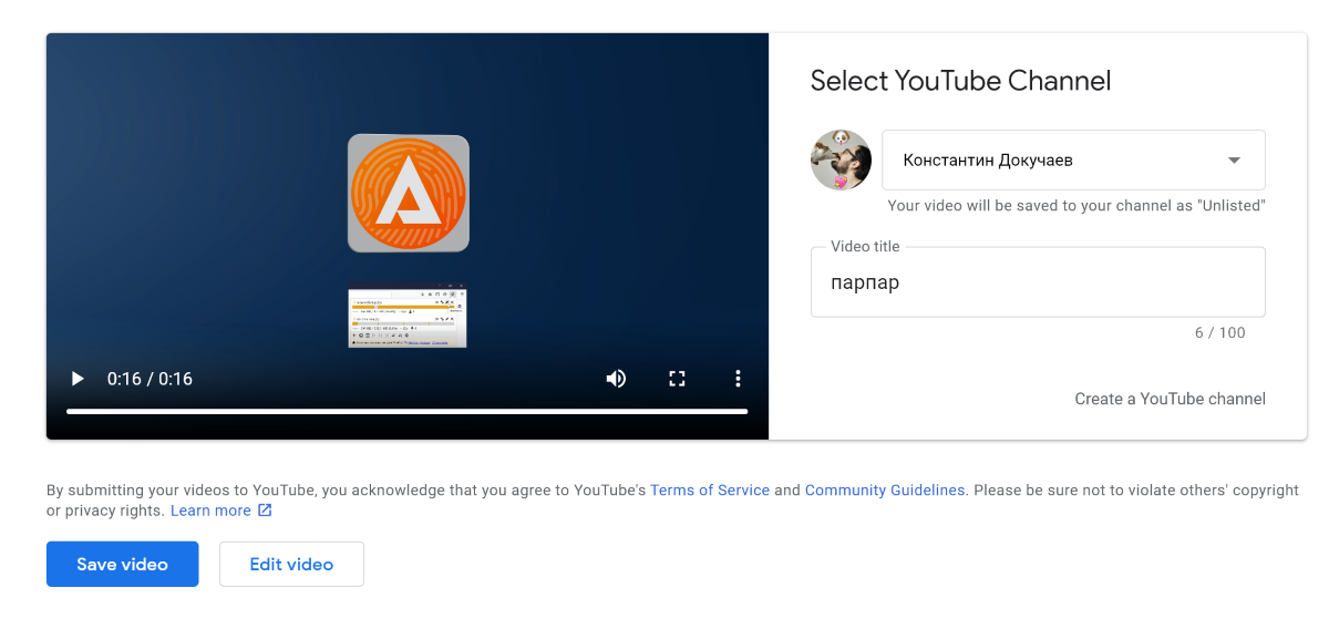 При сохранении шаблона открывается его превью. Здесь можно выбрать название для видео и выбрать YouTube канал для загрузки.