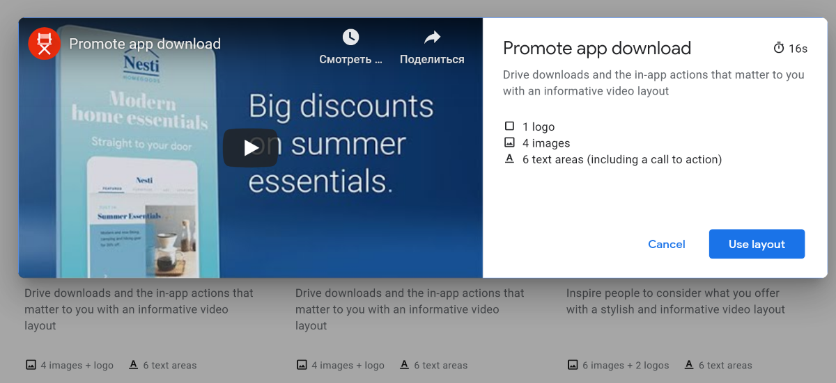 При клике на шаблон открывается окошко, где ещё раз повторяется вся та же информация. Только вместо превью здесь полноценное видео.