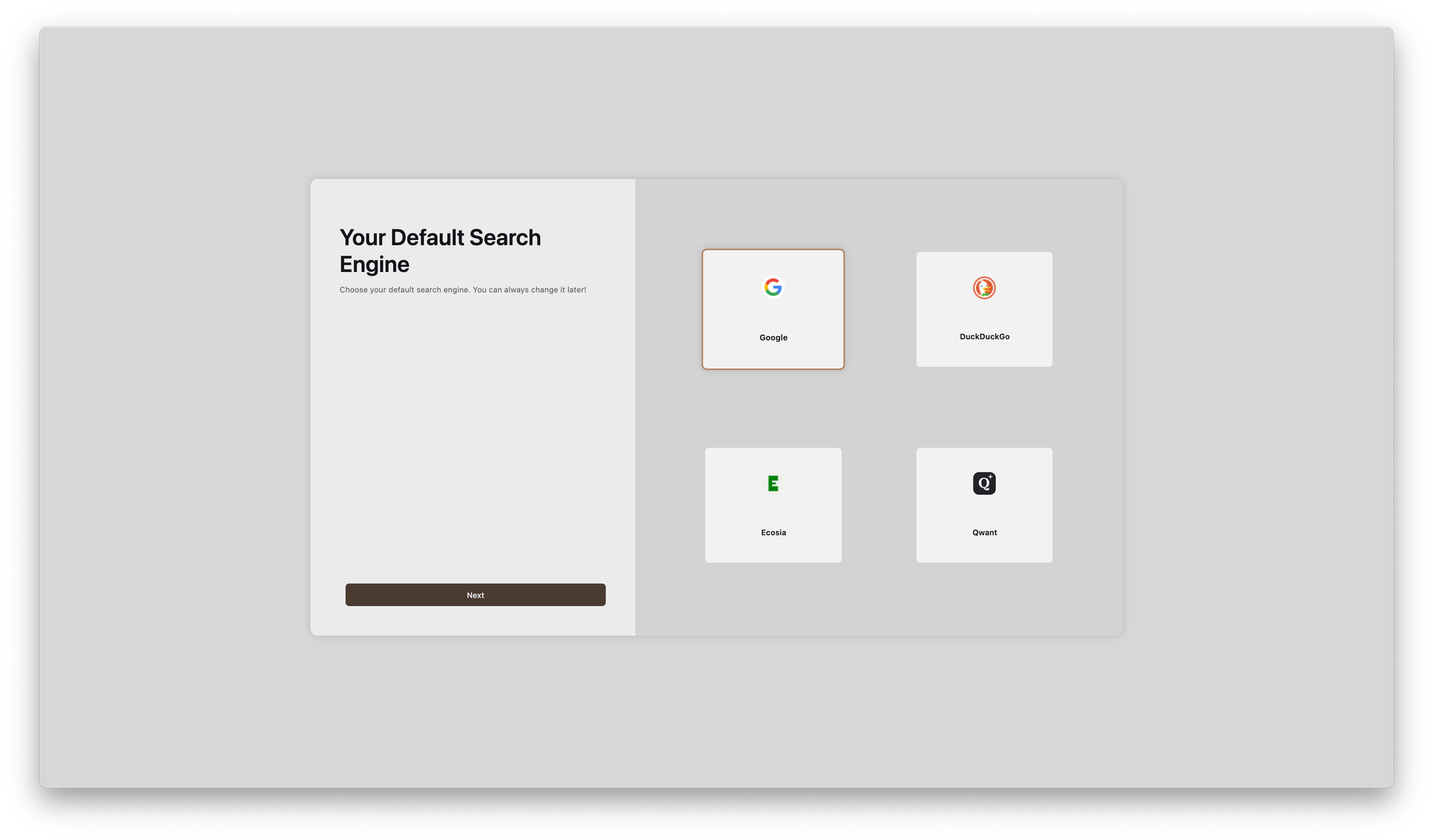 Как обычно, при первом запуске любого браузера вам будет предложено импортировать закладки из конкурентов и сделать Zen Browser браузером по умолчанию. Также можно выбрать поисковик: Google, DuckDuckGo, Ecosia или Qwant.