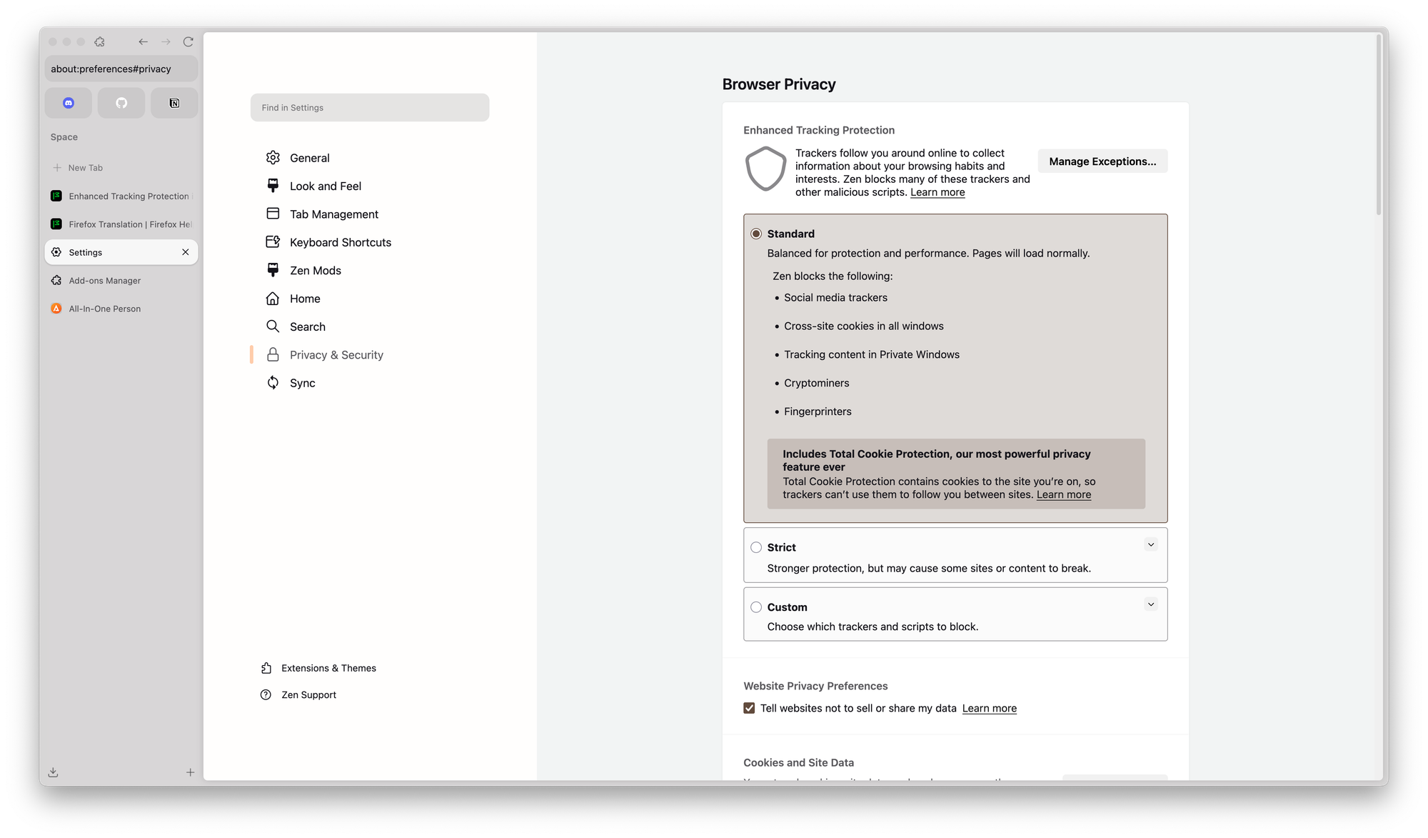 В остальных настройках скрываются те же настройки, что и в Firefox, даже если они и имеют пометку Zen. Например, настройки приватности по факту копируют те же, что и в Firefox. Да и при переходе в справку вы попадёте на сайт Mozilla.