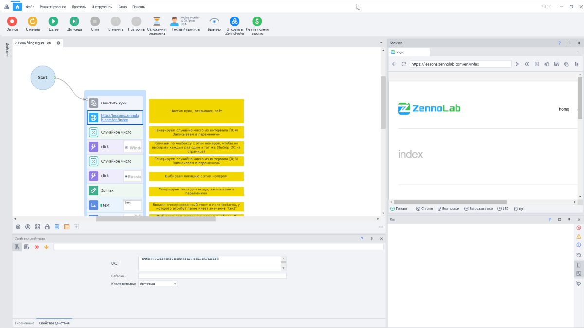 Для наглядности я взял один из готовых проектов — ZennoLab для автоматической регистрации на сайтах. После записи проекта вы увидите примерно такое окно: