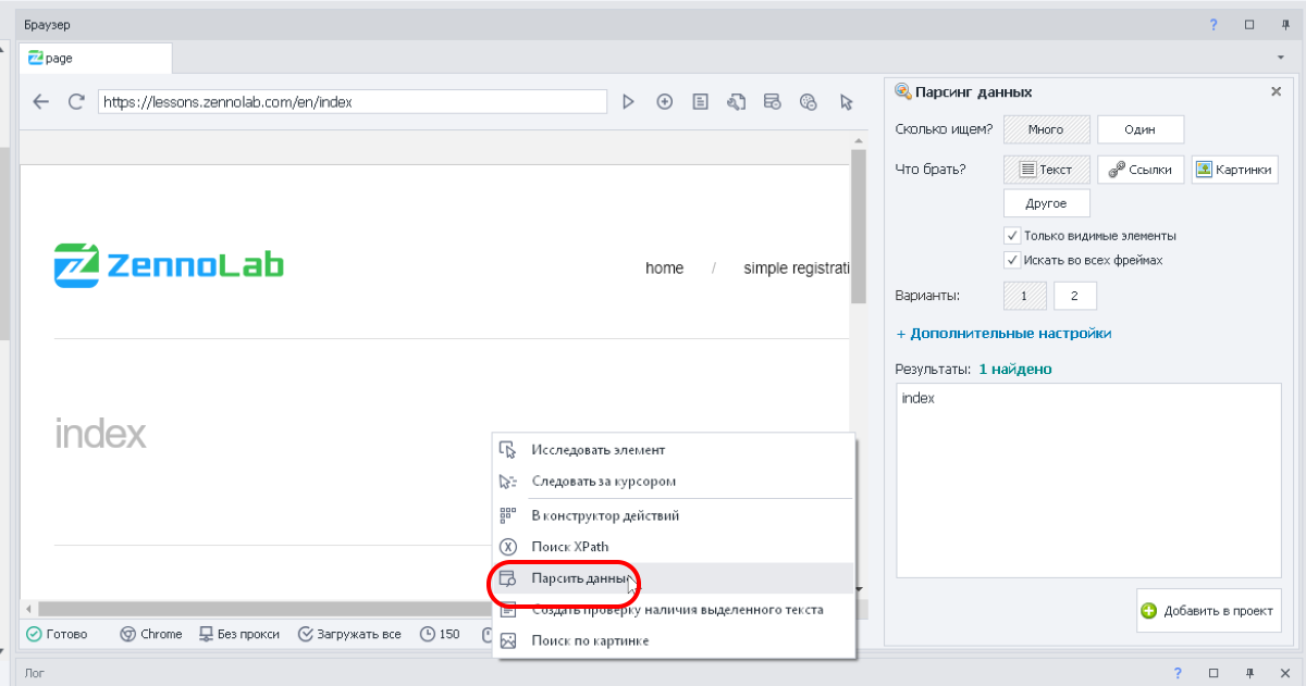 Также можно создавать различные «ветки» действий в зависимости от видимых данных на странице. В программу встроен мощный парсинг данных. Для вызова функции нужно просто кликнуть правой кнопкой мыши по нужному элементу и выбрать Парсить данные. Указать количество элементов для парсинга, выбрать формат данных и добавить их в проект.