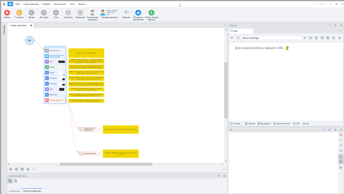 При нажатии на кнопку Запись открывается редактор проекта. На верхней панели инструментов можно настроить профили работы человека и браузера. И другие инструменты, вроде интеллектуального поиска (автоматическое распознавание полей с возможностью обучения), обработки писем и антикапчи (Anti-Gate, CaptchaBot, DeCaptcher и т.д.). Сам редактор доступен в двух режимах: простом (см. ниже) и расширенном, где доступна более гибкая настройка выполнения задач (работа с СМС, базами данных, XML и т.п.).