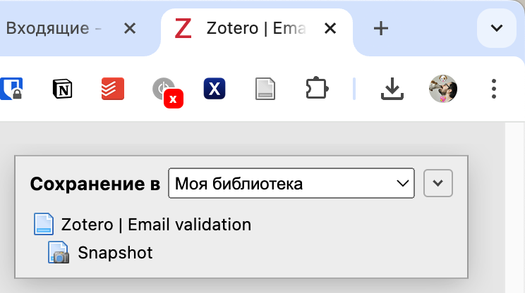 Ещё для полноценной работы потребуется установка Zotero Connector для Google Chrome. Это аналог Clipper из Evernote для сохранения посещённых сайтов.