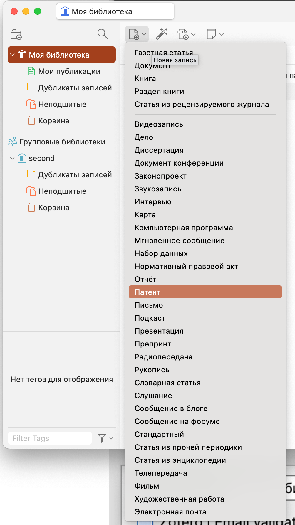 Как я говорил, Zotero оперирует различными «книжными» данными при создании заметок. Выбор — создать газетную статью, патент или рукопись — не сильно на что-то влияет. Но это будет очень полезно, если вы действительно собираетесь хранить газетную статью, патент, рукопись или что-то такое.