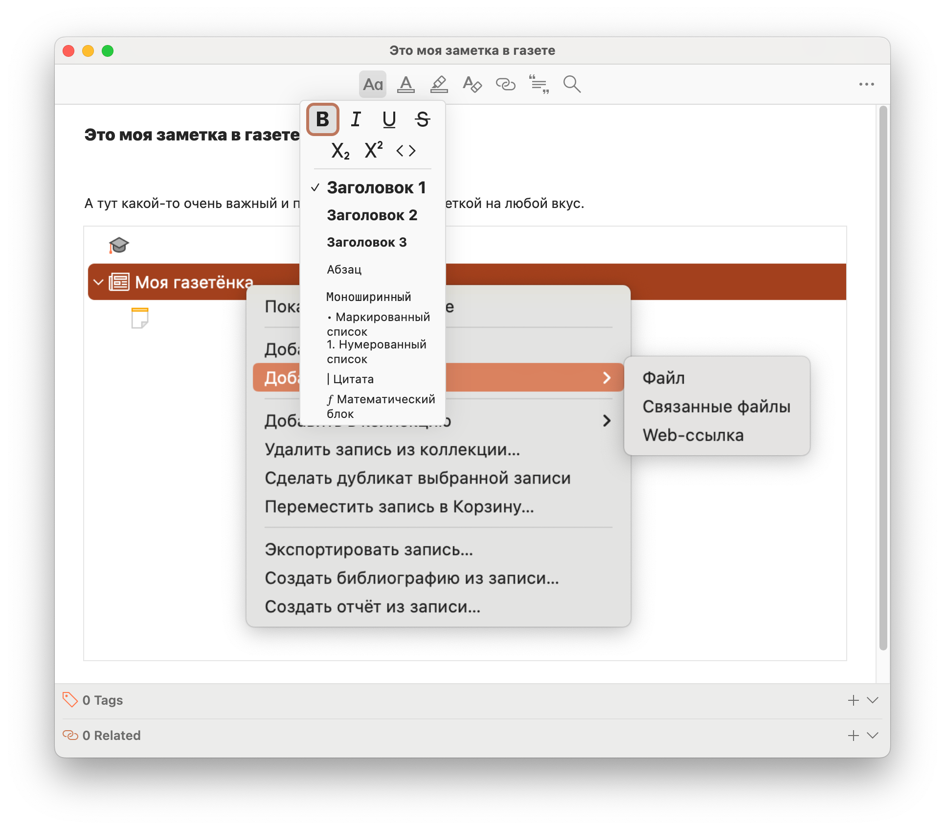 Для заметки доступно базовое форматирование с поддержкой списков, в том числе нумерованных, цитат, ссылок, математических кодов и прочего. А вот из вложений доступны только изображения. Как и к другим данным, можно добавить теги и связанные данные.