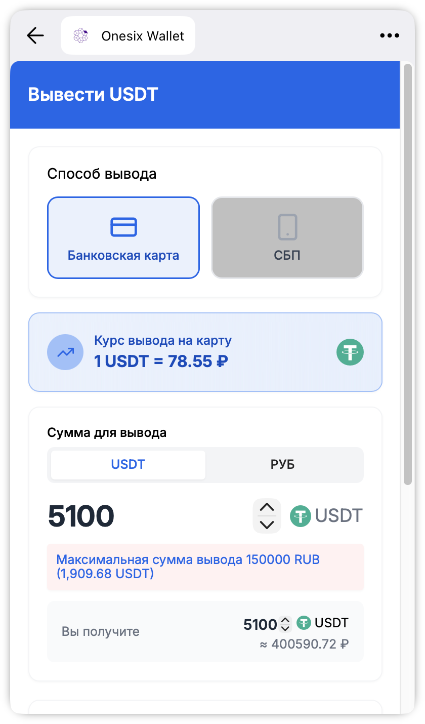 В этом случае вам будет доступен вывод крипты на карту или по СБП. На момент написания статьи минимальная сумма вывода составляет 5100 рублей, а максимальная — 15 000.