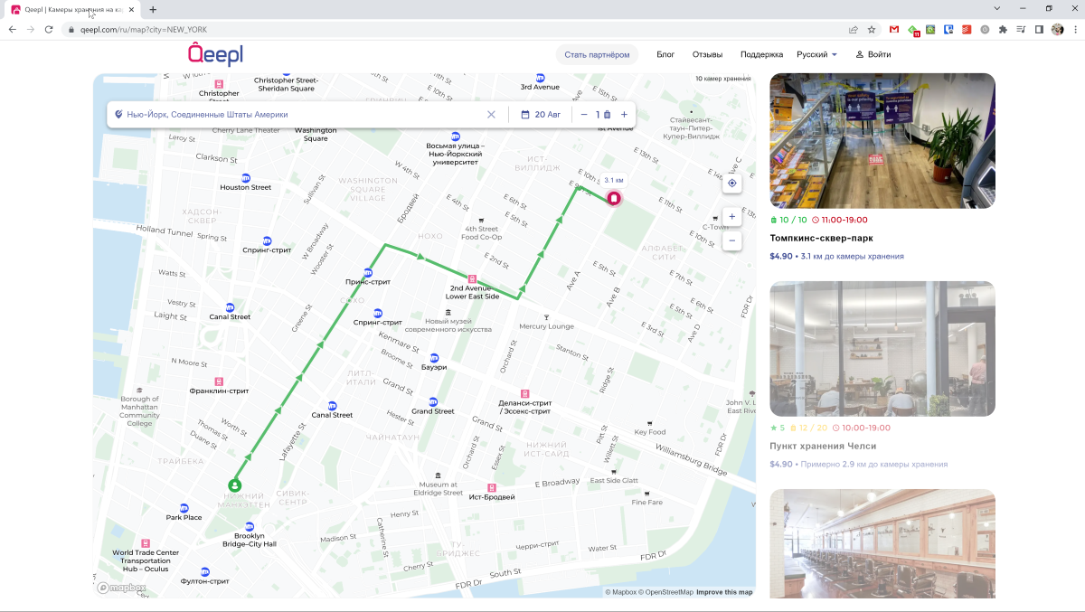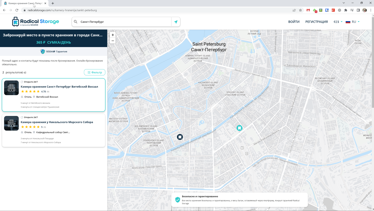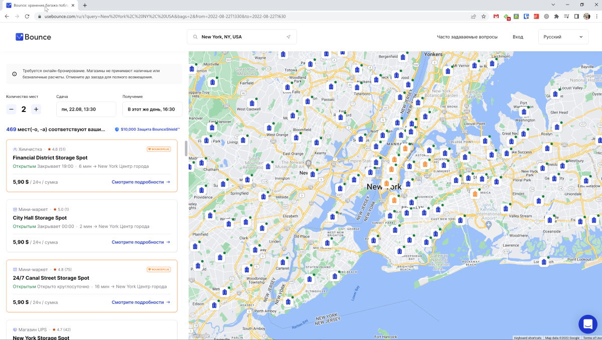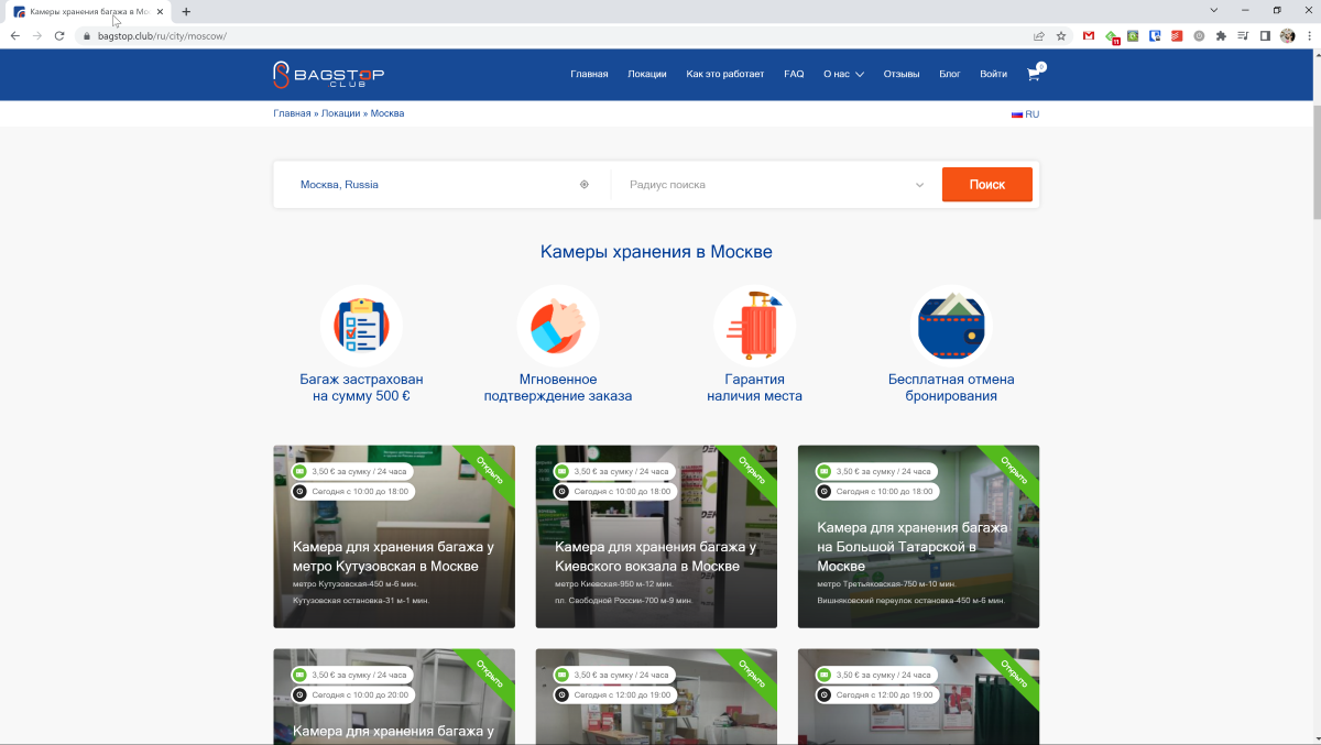 В РФ сервис работает только в Санкт-Петербурге. Пункты хранения есть также в Америке, Франции, Великобритании, Италии, Греции, Таиланде, Египте. В общей сложности компания работает в 1000 городах. Поддержка предусмотрена только на английском языке, есть возможность бесплатно отменить бронь.