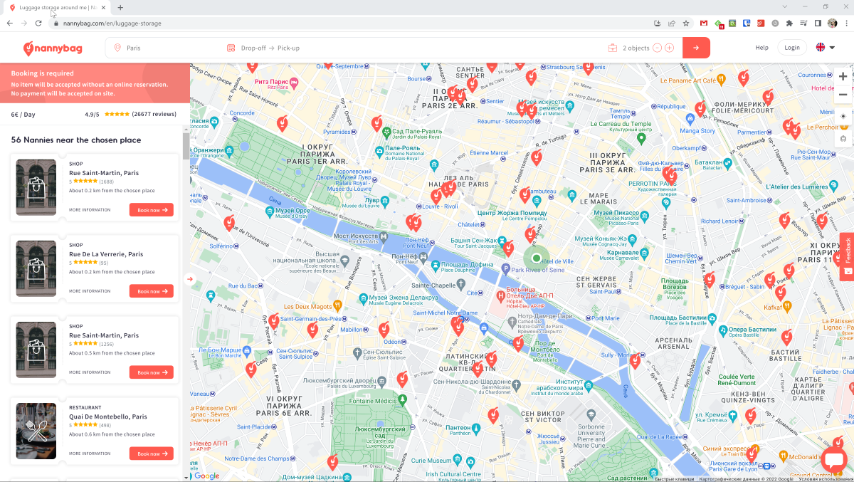 Это приложение от французских разработчиков, которое работает в 500 городах. На русском языке управления пока нет, но есть услуга доставки ваших вещей «до двери». После регистрации вы получаете приятную 5-процентную скидку на первое бронирование. Есть опция отмены брони до начала её действия.