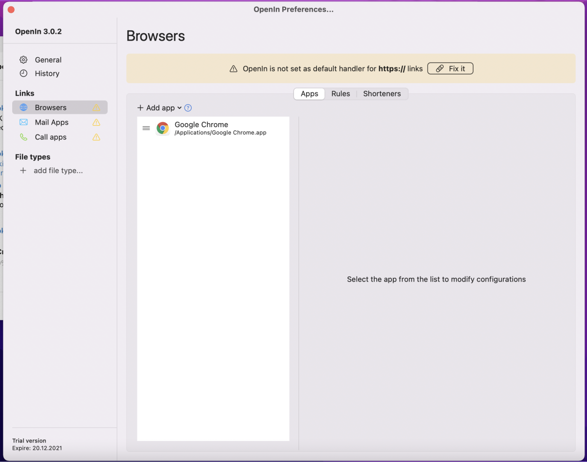 Затем я рекомендую перейти в настройки утилиты, ведь здесь творится вся магия. По умолчанию поддерживается три типа ссылок: браузер, почтовые приложения и звонилки.
