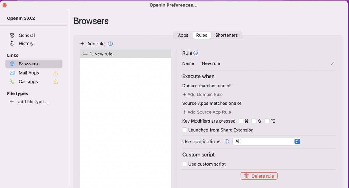 Можно указать совпадение по домену или приложении-источнике ссылке, при использовании определённой горячей клавиши и многое другое.