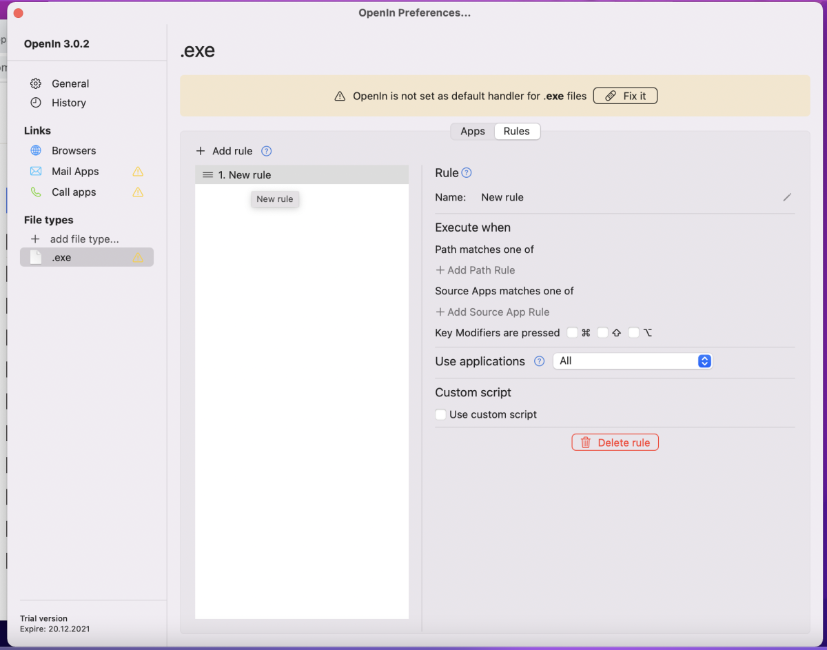Аналогичная настройка доступа и для остальных типов ссылок. А в разделе File types можно настроить открытие определённых типов файлов в нужном вам приложении. Здесь также есть возможность задавать правила, но уже на основании пути до файла.