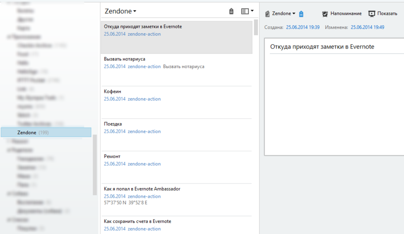 Zendone - GTD система, полностью завязанная на Evernote. Обзор системы и способы применения можно прочесть здесь. В конечном счете, все мои дела оказываются в блокноте Zendone.