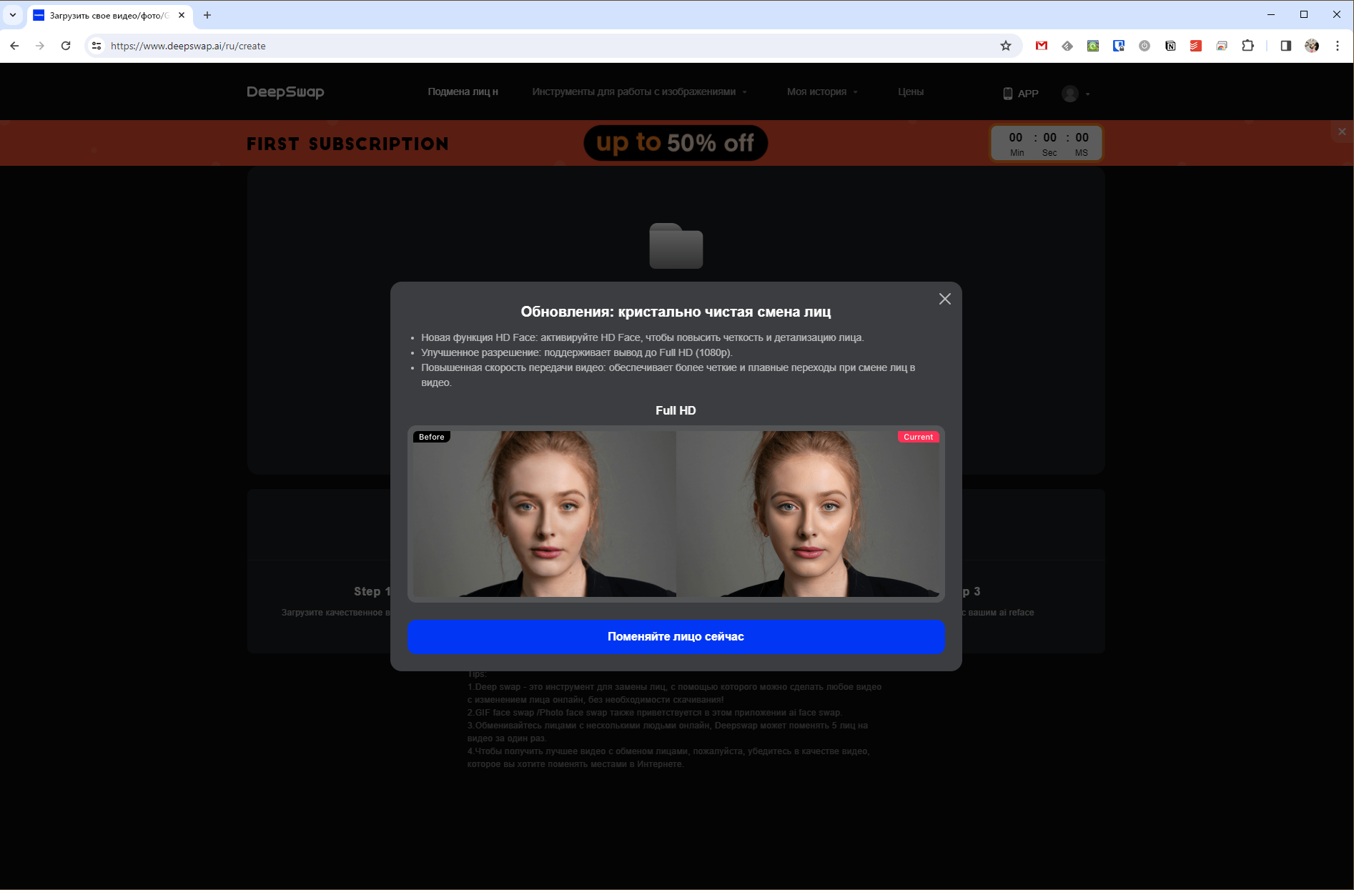 Как можно догадаться из названия, этот сервис работает на основе алгоритма Deepswap. А значит, можно дорисовывать или полностью заменять лица на изображениях.