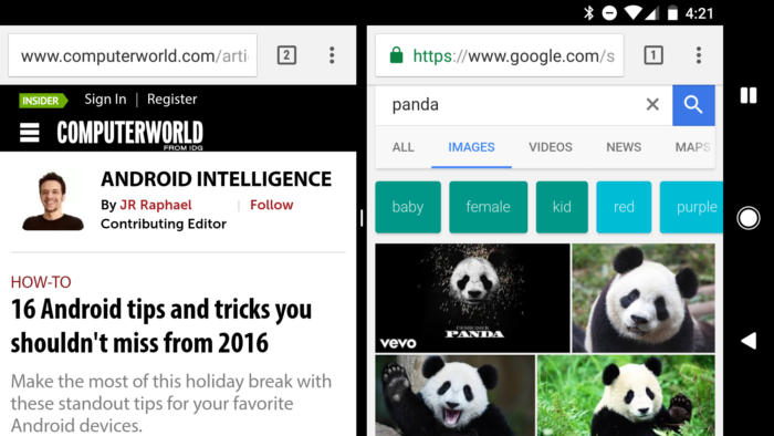 Малоизвестный факт: вы можете использовать режим разделённого экрана Nougat для просмотра двух разных вкладок Chrome. Откройте новую вкладку в Chrome, нажмите и удерживайте клавишу «Обзор», а затем тапните значок с тремя точками в правом верхнем углу браузера. Ищите вариант «Переместить в другое окно».