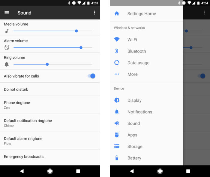 Есть необходимость переходить между разделами в настройках системы? Для этой цели в «Нуге» имеется новое меню с быстрой навигацией. Проведите пальцем от левой части экрана к центру или найдите значок «гамбургер» (три горизонтальные линии) в верхнем левом углу, чтобы открыть это меню.