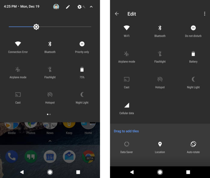 Значки «Быстрых настроек» в «Нуге» полностью настраиваемы. Дважды проведите пальцем вниз от верхней части экрана и тапните команду редактирования – либо слово «Редактировать» в правом нижнем углу экрана, либо значок карандаша в правом верхнем углу. Вы сможете переставлять иконки и добавлять или удалять функции из списка.