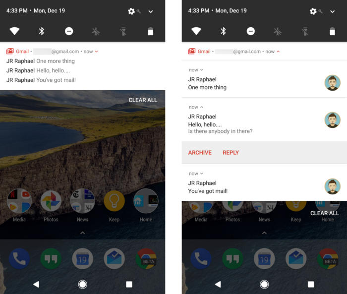 - Уведомления в «Нуге» группируются по принадлежности к определённым приложениям. Так что если у вас есть, скажем, три новых сообщения от Gmail, все они появятся в пределах одной карты на панели уведомлений. Вы можете нажать любую такую карту, чтобы она развернулась на отдельные мини-карты с более подробной информацией. После чего можете тапнуть любую из мини-карт и тем самым получить доступ к кнопкам действий (например, командам для архивирования или ответа).
