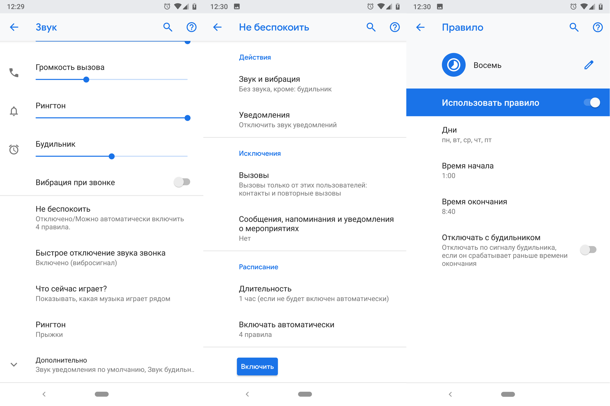 В правилах можно задать периоды включения/выключения режима. Можно автоматически отключать звук во время мероприятий в Google Календаре. При этом можно отключать звук только во время важных мероприятий, а не всех подряд. Для этого в Календаре надо выставить статус «Занят».