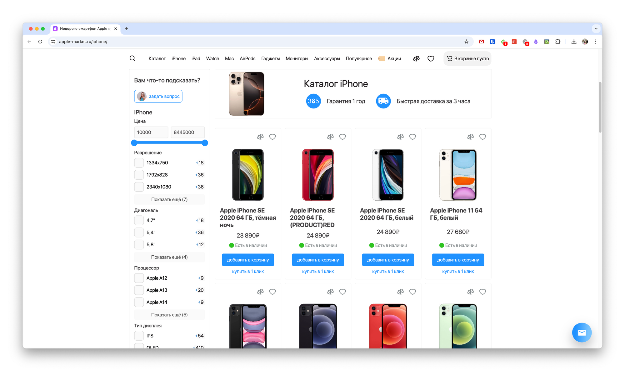 В магазине Apple-Market в Москве можно купить Айфон разных моделей. На устройства распространяется официальная гарантия. Консультанты ответят на интересующие вопросы, расскажут об ассортименте смартфонов и помогут подобрать девайс с учётом цены, технических характеристик и личных предпочтений. При необходимости для смартфона будут подобраны аксессуары: защитная плёнка/стекло, чехол, зарядное приспособление, наушники. Также можно купить Apple Watch, которые станут отличным дополнением для любого iPhone.