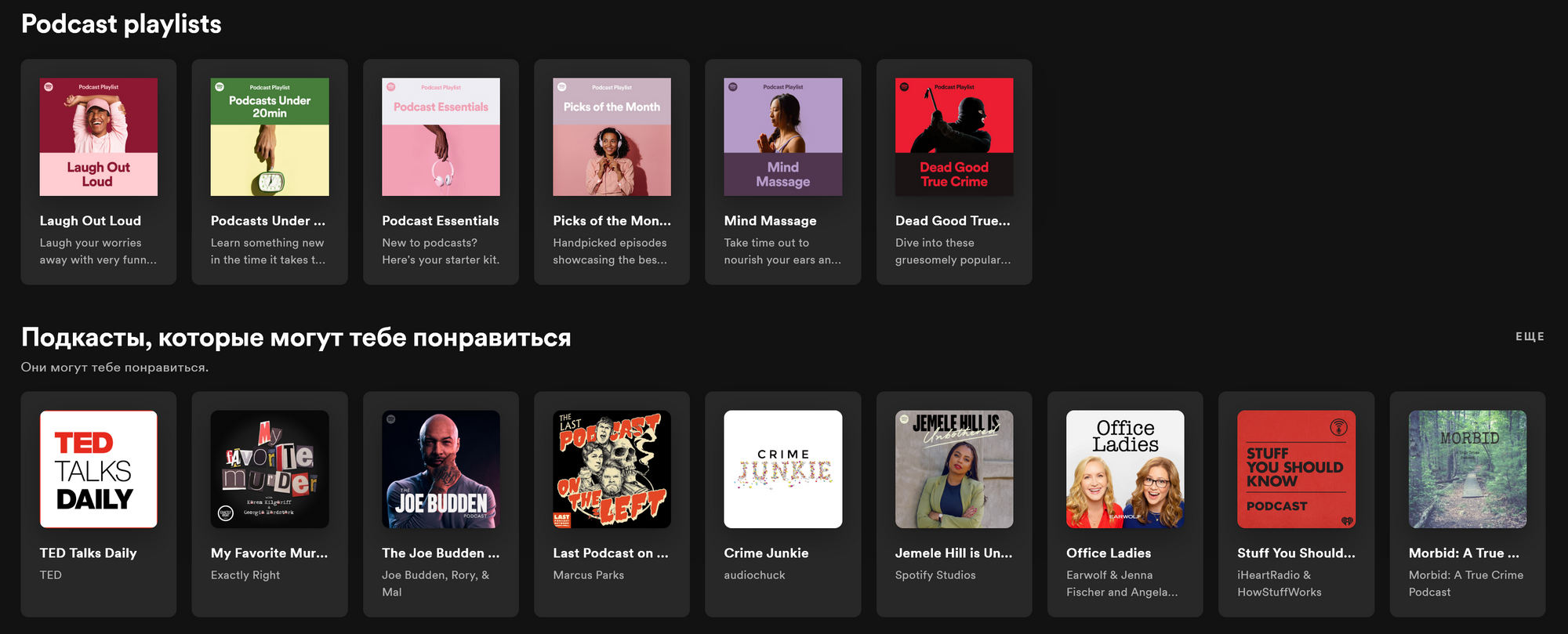 Кроме музыки, на платформе есть подкасты и концерты. Как и треки, их можно скачивать в офлай.