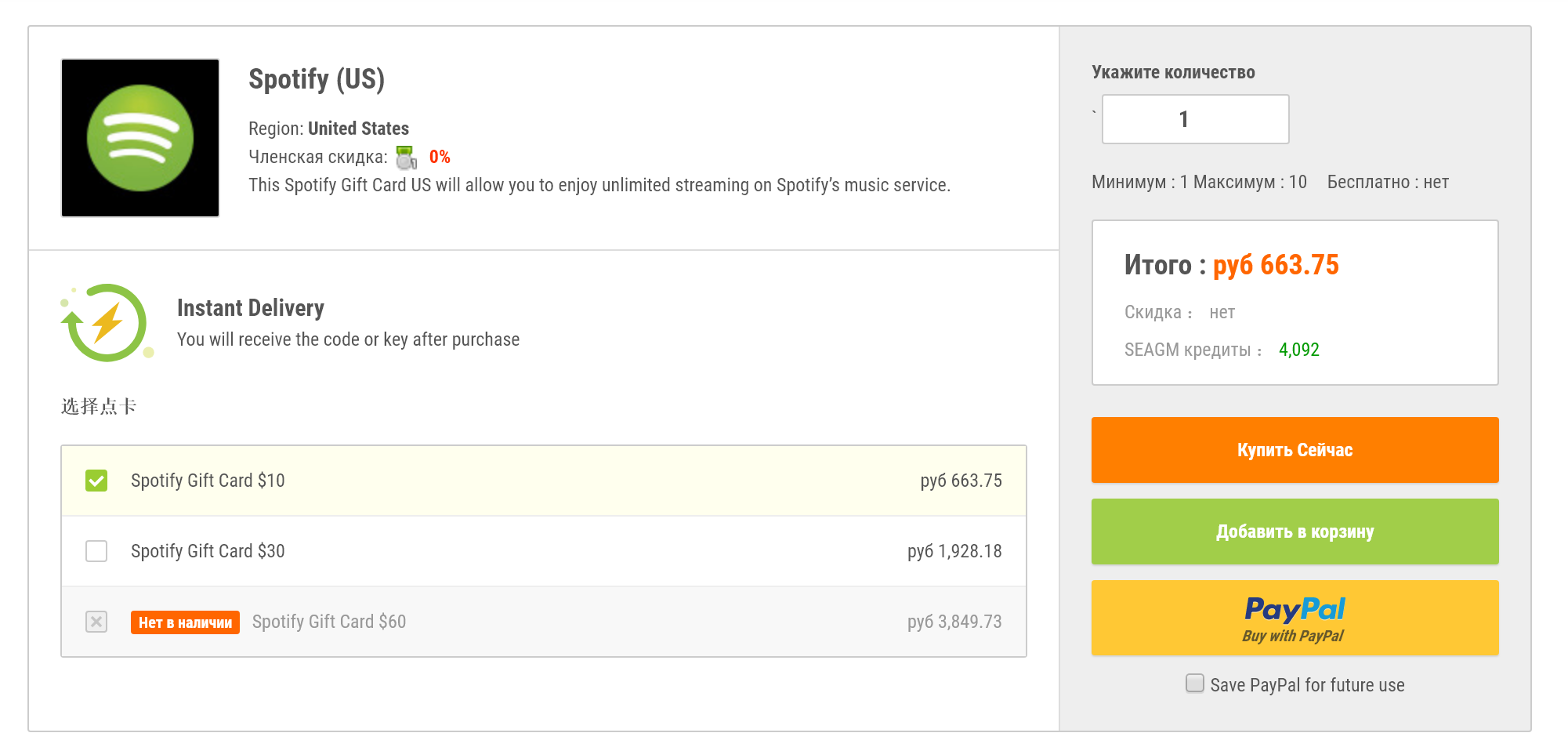 На сайте SEAGM это можно сделать без проблем. Только учтите, что регион карты должен совпадать с регионом аккаунта Spotify.