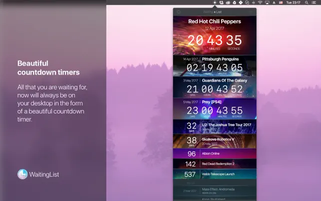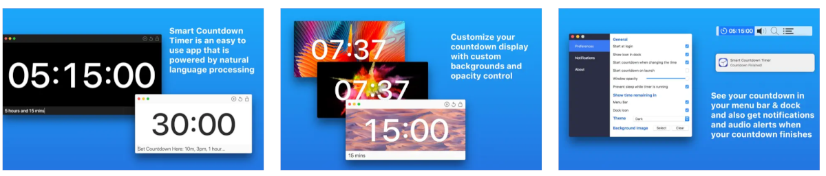Можно назвать профессиональным приложением для работы с таймерами, секундомерами, отсчётами до даты и прочими счётчиками. В платной версии за $35.94 вам накинут полноэкранный режим, режим иконок, поддержку AppleScript, открытие сайтов, отправку почты и многое другое.