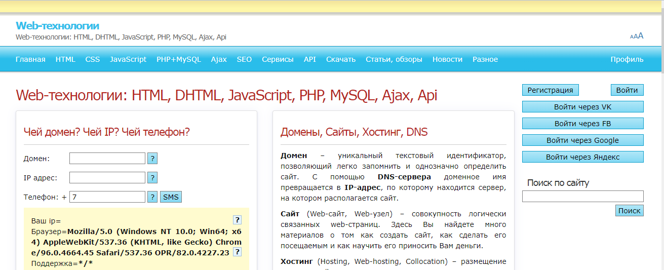 Web-технологии. Библиотека определений и материалов по web, также здесь можно найти тематические подборки сервисов для разработчиков и решения важных задач. Простой и понятный интерфейс, обилие важной информации — конек сайта. Библиотеку хорошо использовать для подготовки к собеседованию, чтобы вспомнить базовые определения и термины.