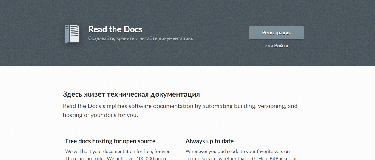 Read The Docs. Портал для чтения, хранения и создания документации. Отличается простым и удобным интерфейсом, содержит базу документов по большинству языков программирования, а также библиотекам и фреймворкам.