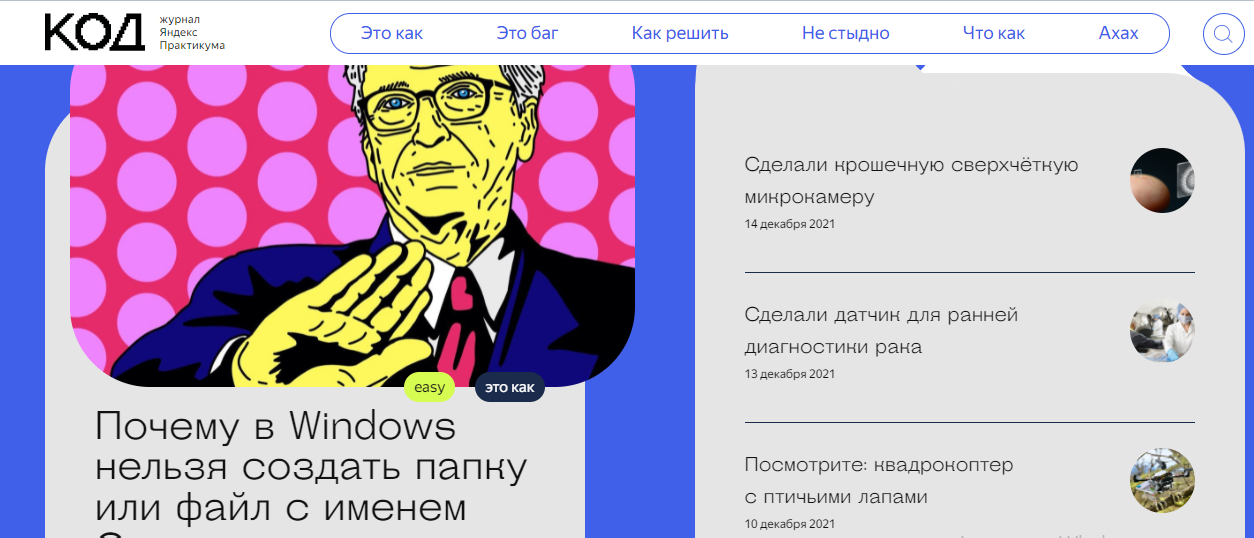 КОД. Информационный журнал от Яндекс.Практикума о программировании и IT-технологиях. Предлагает экспертные статьи, причем не только на профильные темы, но и на смежные - например, про профессиональное выгорание в IT или токсичный коллектив. Изобилует забавными тестами, задачами, подборками, отличается креативным визуальным оформлением.