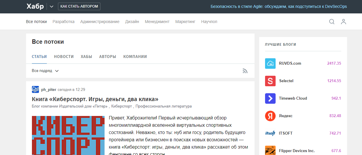 Хабр. Святая святых айтишника, крупнейший русскоязычный специализированный ресурс в Европе. Работает как коллективный блог в сочетании с тематической новостной лентой. Реализовано удобное разделение ленты на категории, поэтому ее можно настроить под свои нужды. Публикуется много инструкций, рекомендаций и статей по программированию, часто проскакивают полезные обсуждения в комментариях. К минусам можно отнести почти полное отсутствие модерации комментариев, поэтому среди пользователей регулярно возникают перепалки.