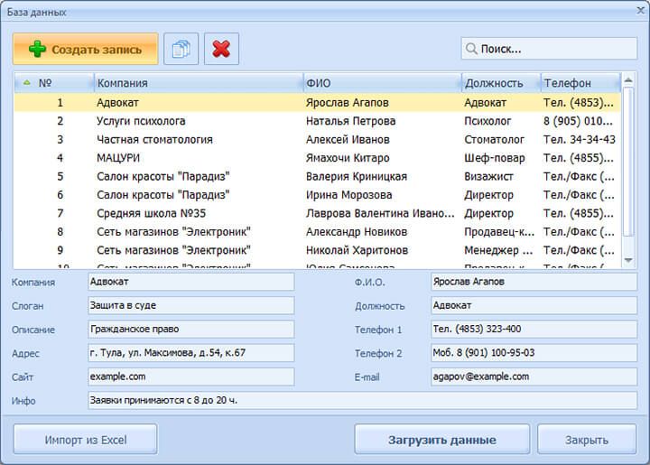 В конструкторе есть также база данных, которая нужна для хранения данных об организации и её сотрудниках. Благодаря этому вы можете быстро добавлять и применять информацию для создания визиток. В базе есть система поиска, благодаря которой можно легко найти нужную информацию.