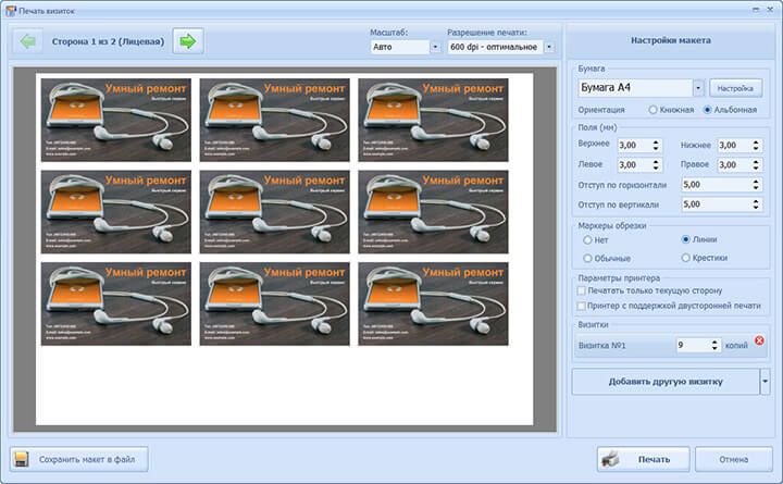 Кроме того, программа позволяет распечатать визитку в домашних условиях. Для печати карточек подходит бумага любого типа и размера, всё зависит лишь от ваших пожеланий. Чтобы легко обрезать визитку, можно установить специальные маркеры обрезки и разместить макеты на странице. Для предварительной проверки есть функция пробной печати. Благодаря этому вы будете уверены в том, что окончательный результат вас полностью устроит.