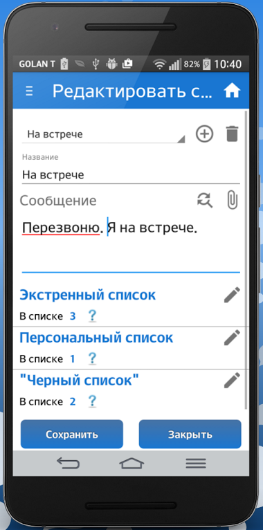 СМС Автоответ на звонки и смс автоматически отправляет текстовые сообщения на пропущенные звонки и входящие смс, переводя телефон в беззвучный режим, когда вы заняты, за рулём, на встрече, в кино, спите, в школе и т.д.