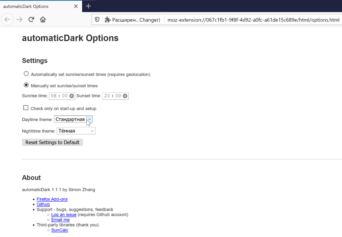 automaticDark поможет переключать темную тему браузера автоматически по времени.