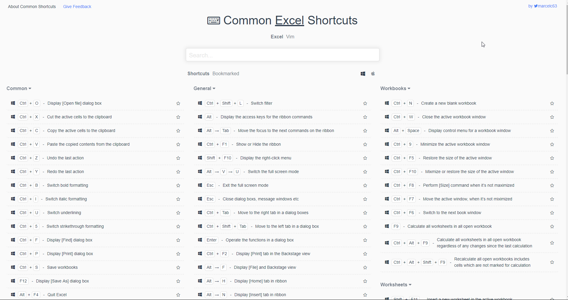 Commun Shortcuts — веб-сайт с подборкой горячих клавиш для Excel и Vim на Windows и Mac.