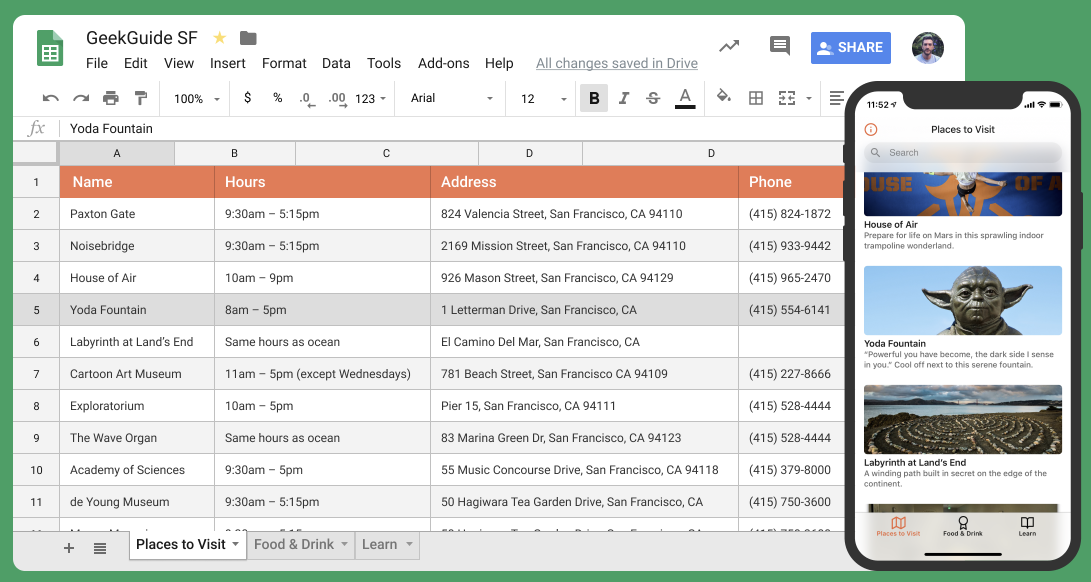 Glide — веб-сервис, который помогает сделать мобильное приложение на основе данных Google таблиц.