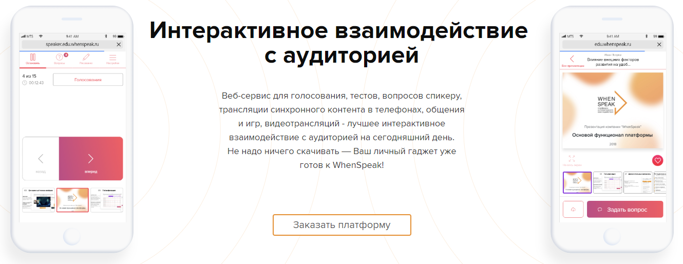 WhenSpeak — веб-сервис для голосования, тестов, вопросов спикеру, трансляции синхронного контента в телефонах, общения и игр, видеотрансляций — лучшее интерактивное взаимодействие с аудиторией на сегодняшний день.