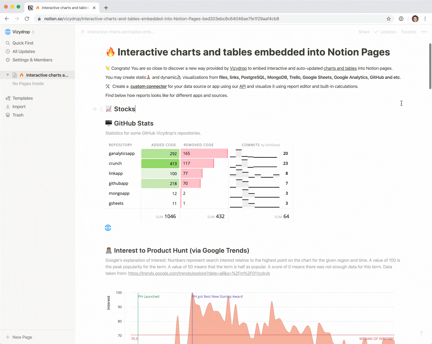 Reports for Notion поможет добавлять интерактивные автообновляемые таблицы из Google Sheets, CSV файлов, JSONs, GitHub, Trello и многое другое прямо в заметки Notion.