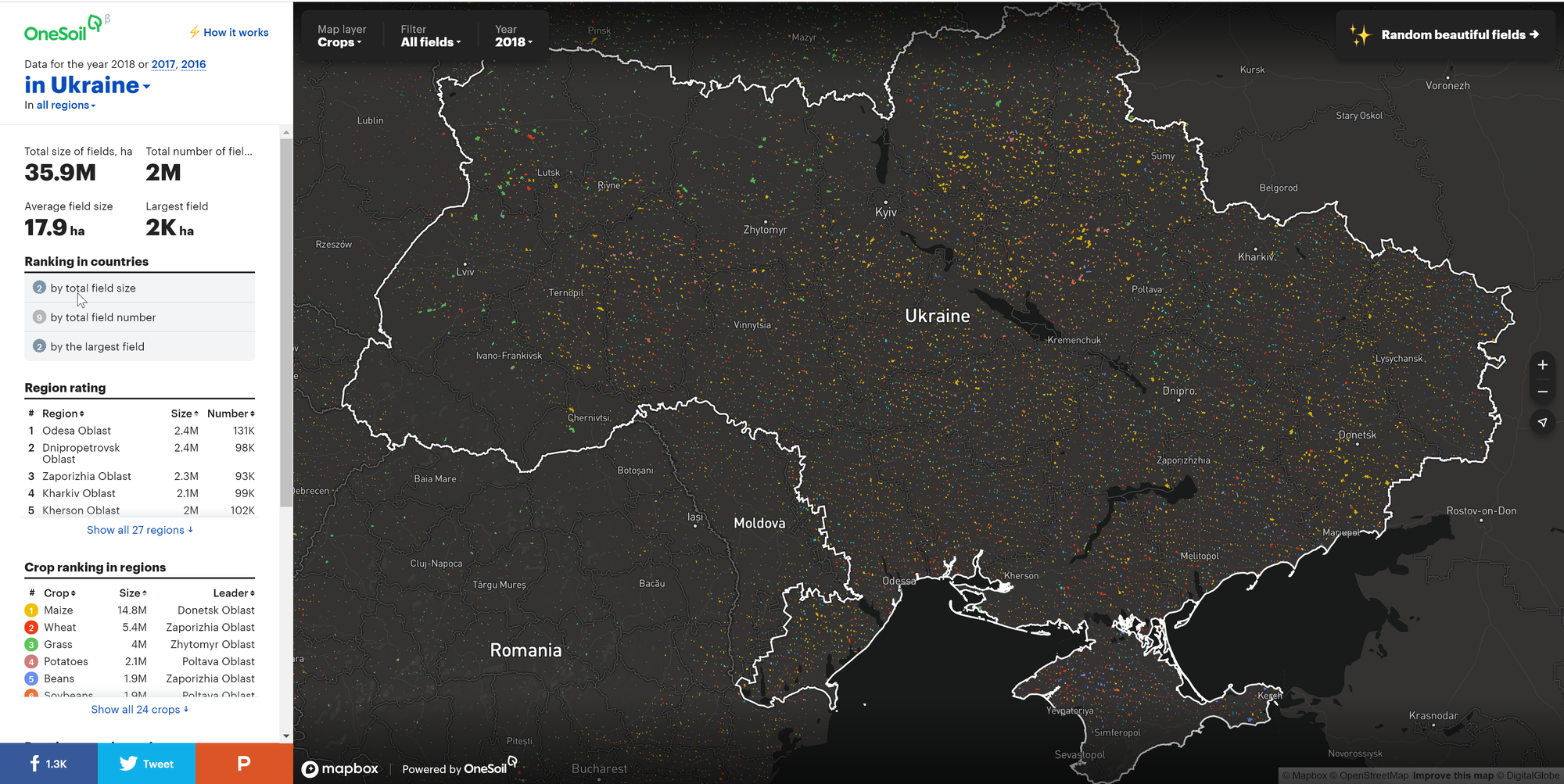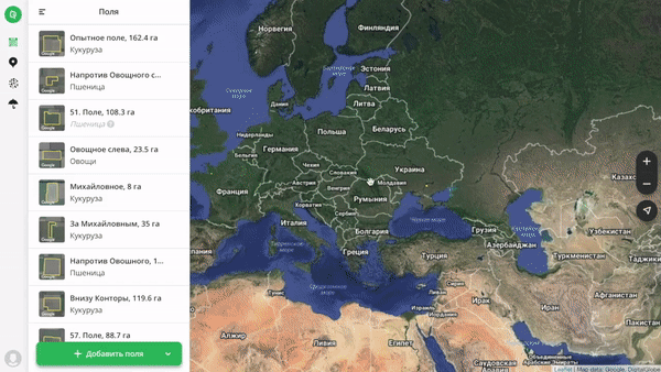 OneSoil Map — интерактивная карта, на которой отмечены все поля в Европе и США.