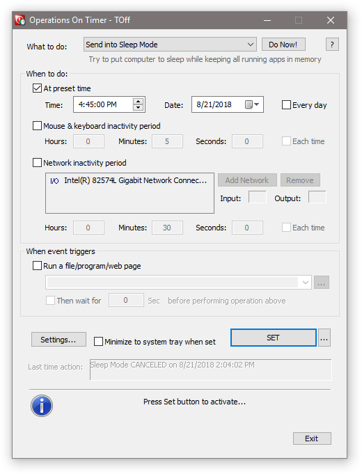 - Может выключить, перезагрузить или выйти из системы практически в любой операционной системе Windows в нужный момент времени или после определенного состояния бездействия.