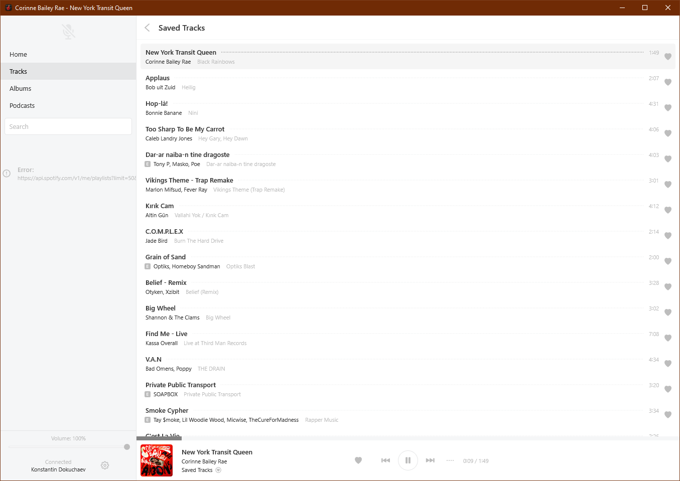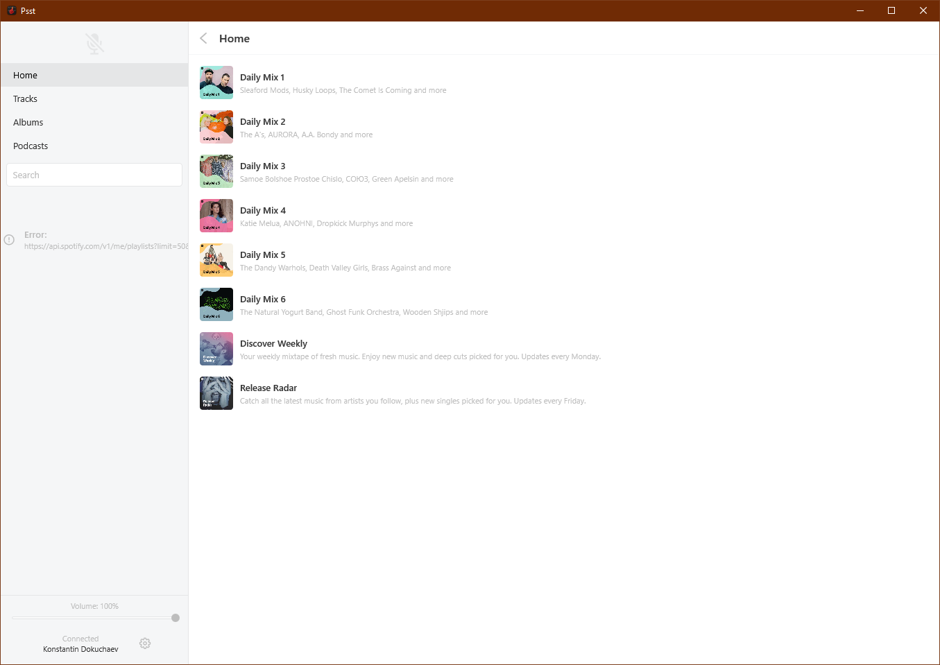 На данный момент в Psst доступна самая базовая функциональность: выбор плейлистов, доступ к избранным трекам и альбомам, подкасты и поиск по медиатеке. Есть поддержка медиаклавиш, нормализации аудио и тёмной темы.