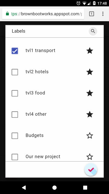 Во первых, я вошел в сервис и создал 4 ярлыка для группировки расходов - транспорт, отели, питание, прочее. Отметил ярлыки как любимые на время путешествия, чтобы было удобнее их выбирать.