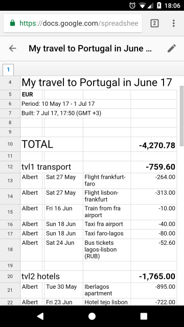 В третьих, по возвращении из путешествия за минуту настроил в сервисе выходную форму и получил Google таблицу с полным отчетом. За две недели накопилось около 100 операций! Анализ был вполне интересен. Стоимость перемещения на такси и автобусах в Португалии почти в два раза ниже, чем в Германии. А незначительные покупки сувениров, подарков и безделушек в итоге обернулись суммой почти в половину расходов на питание.