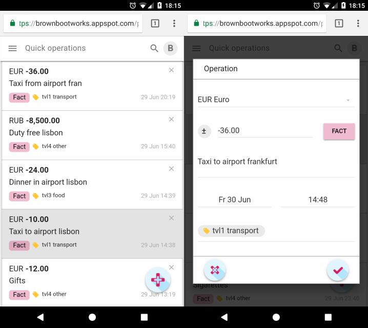 Наверняка на рынке существует множество сервисов для планирования путешествий и для учета персональных финансов. Я не стал их искать. Для управления своими личными и бизнес делами я использую сервис Brown Boot Works. Он всегда со мной. В сервисе есть разделы Быстрые финансовые операции и Бюджеты. Функциональность вполне соответствует описанным выше требованиям. Я решил попробовать.