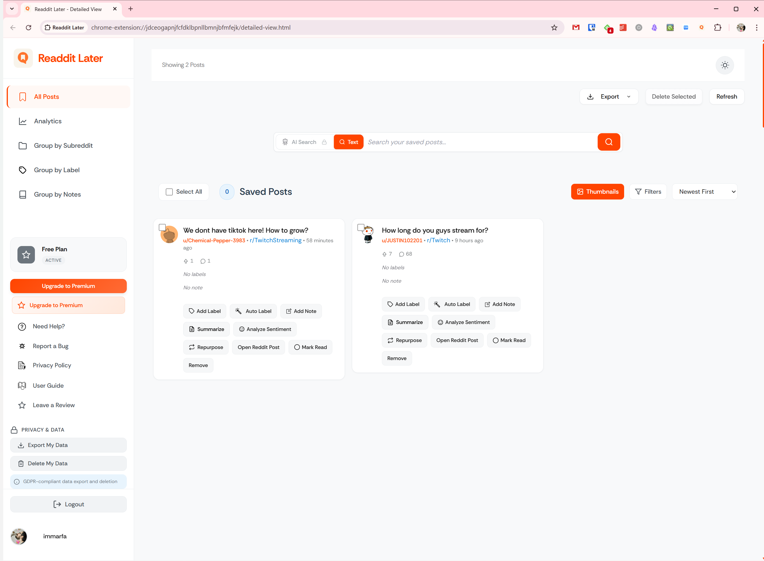 К постам можно добавлять лейблы (вручную или автоматически), заметки, производить их суммаризацию и анализ, и переиспользовать. Правда, при клике на карточку открывается исходный пост на Reddit. То есть речи о полноценном офлайн-сохранении нет, если вы не подключили интеграцию с Notion.