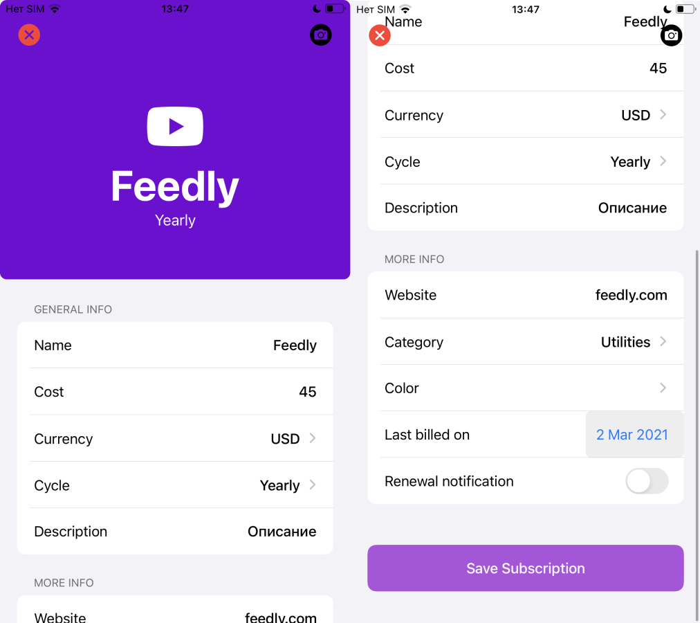 В приложение можно добавить любую подписку на любой сервис. Для этого в карточке подписки доступны все необходимые поля. Можно указать название, добавить цену в необходимой валюте, указать цикл списания (каждый день, неделю, месяц, год), указать дату последнего списания, выбрать категорию и многое другое.