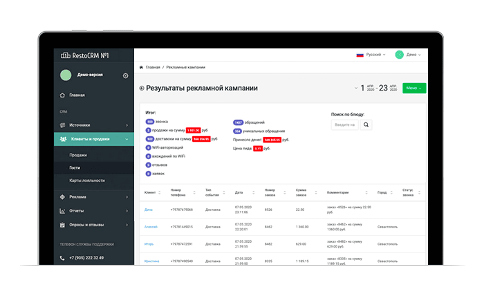 Платформа синхронизируется с кассовыми системами, телефонией, сайтами и даже гостевой инфраструктурой. Wi-Fi с авторизацией не только поможет собрать контакты посетителей, но и предложить им оставить отзыв или скачать меню. Для служб доставки интеграция с iiko и r_keeper позволяет отслеживать все заказы — от самовывоза до работы с агрегаторами.