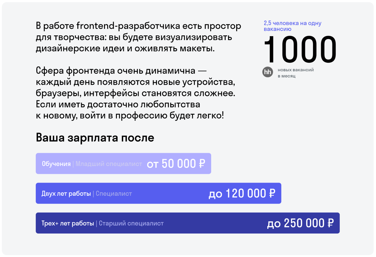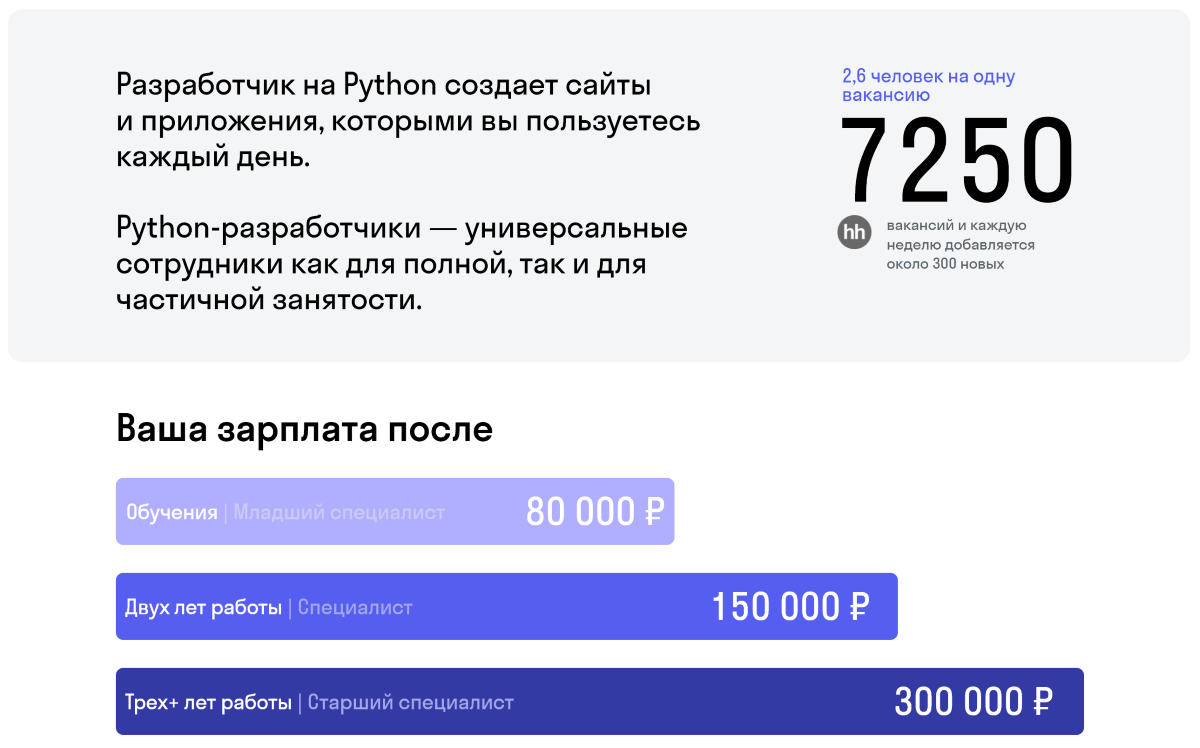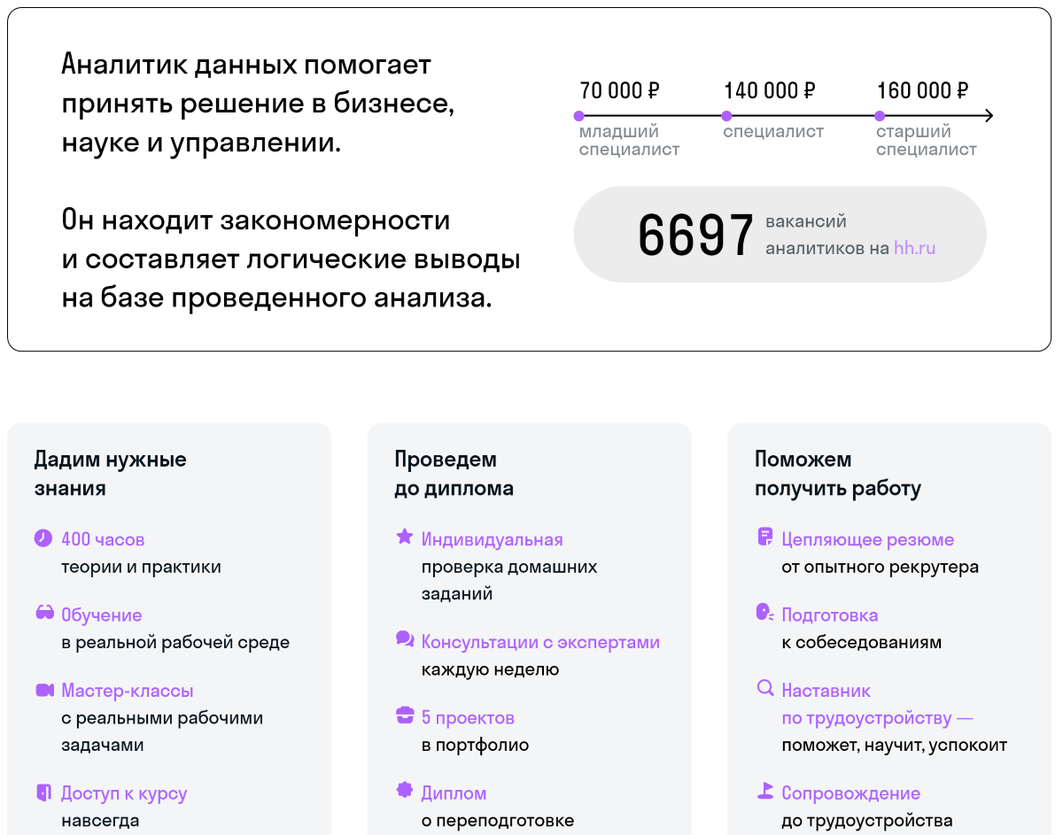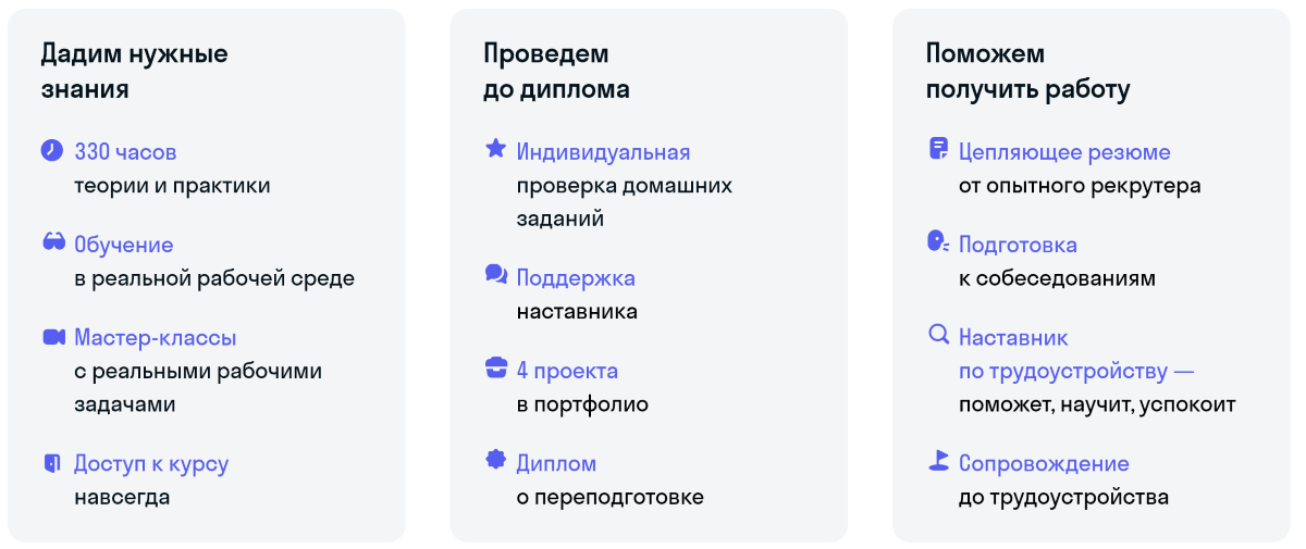 Гарантия, что студенты найдут работу. В составе курсов учтены самые частые требования работодателей к специалистам без опыта. Поэтому на выходе студенты получают все необходимые навыки, с которыми точно возьмут на работу.
