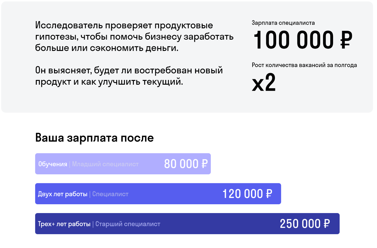 Чем занимается. Проверяет продуктовые гипотезы, чтобы помочь бизнесу зарабатывать больше. Собирает отзывы клиентов, анализирует опыт конкурентов. Выясняет, будет ли востребован новый продукт и как улучшить текущий.